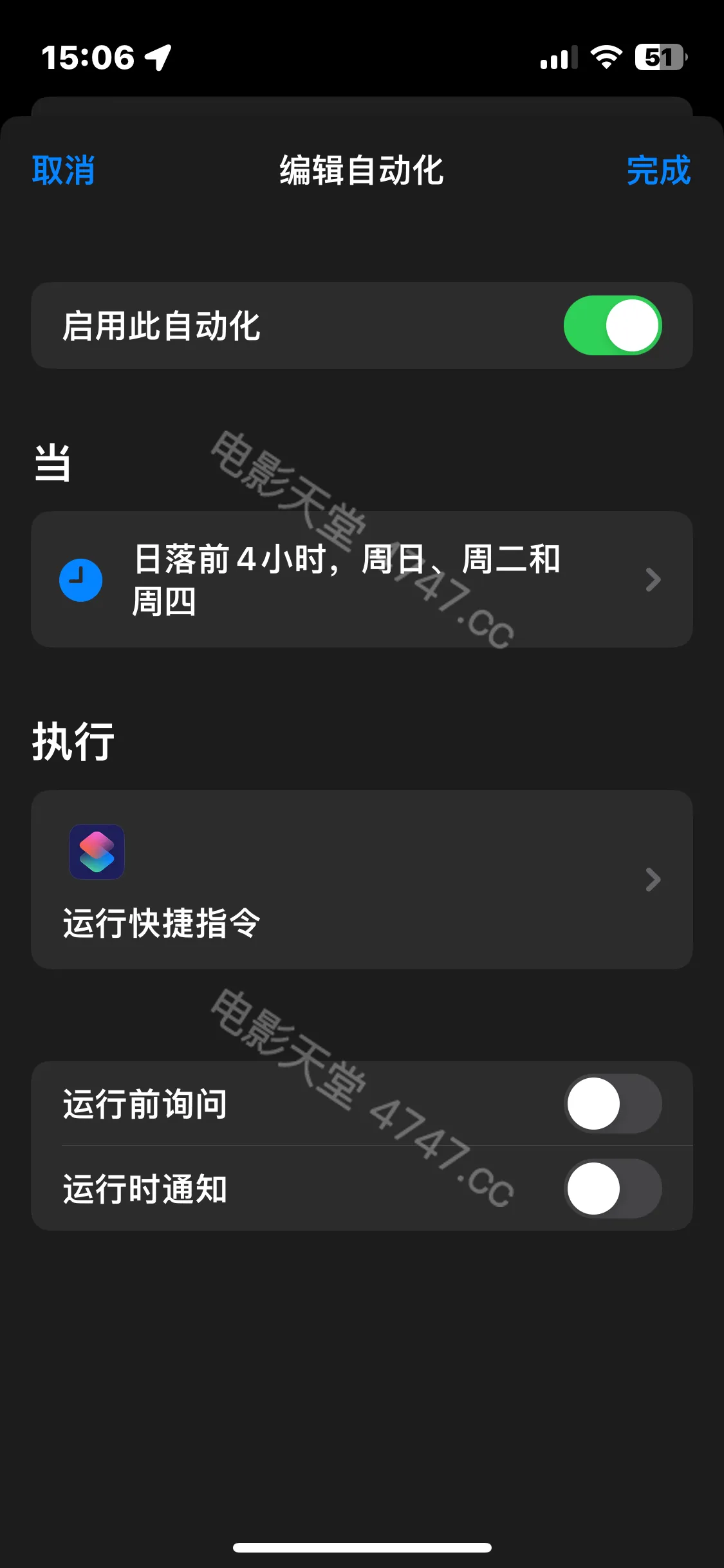在快捷指令库里,设置一个自动化,这个根据个人的习惯来,因为我基本上每天都离在电脑旁边,因此设置了日落前4小时内自动触发。